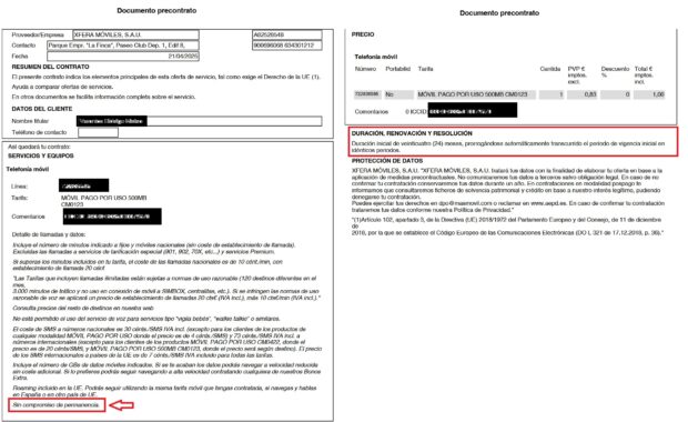 Todo ello podrás verlo en el contrato que recibirás por SMS para tu validación. Abajo te mostramos un ejemplo de contrato donde se detalla lo anterior:
